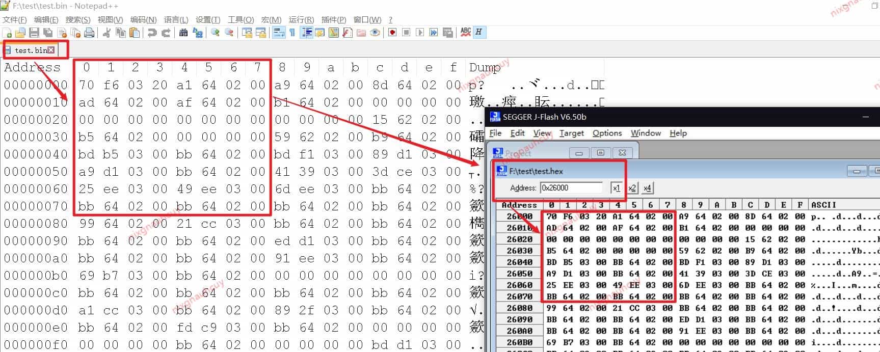 下面这张图可以看出,J-Flash 解析 test.hex 地址信息后,实际上要烧录的还是 test.bin 的内容: