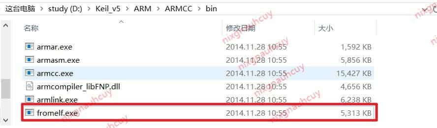 在 Keil 的安装目录下,我的装在了 C 盘,在 C:\Keil_v5\ARM\ARMCC\bin 中,可以找到 fromelf.exe 这个可执行文件
