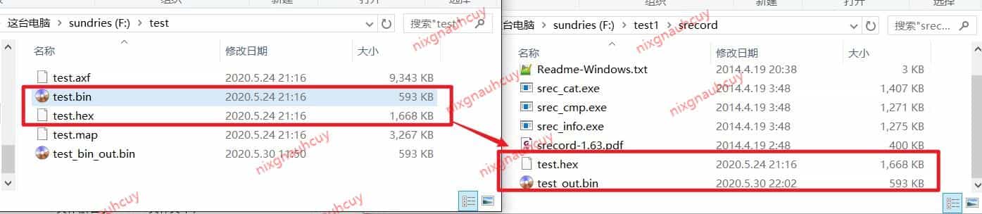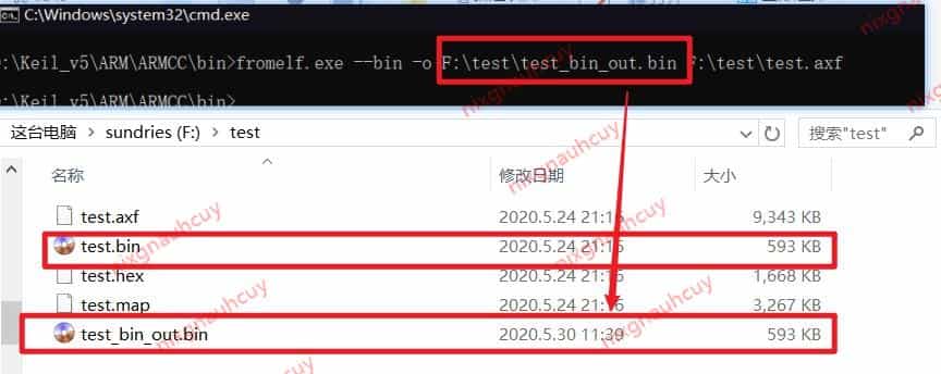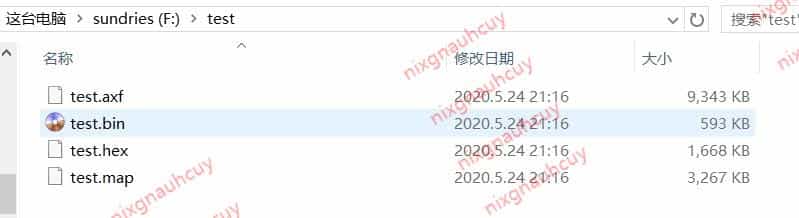 可以看到在输出目录 F:\test 中,将 axf 文件转化生成为了 bin 文件,并且输出的 bin 文件和 keil 生成 bin 文件大小一致,说明是相同的文件