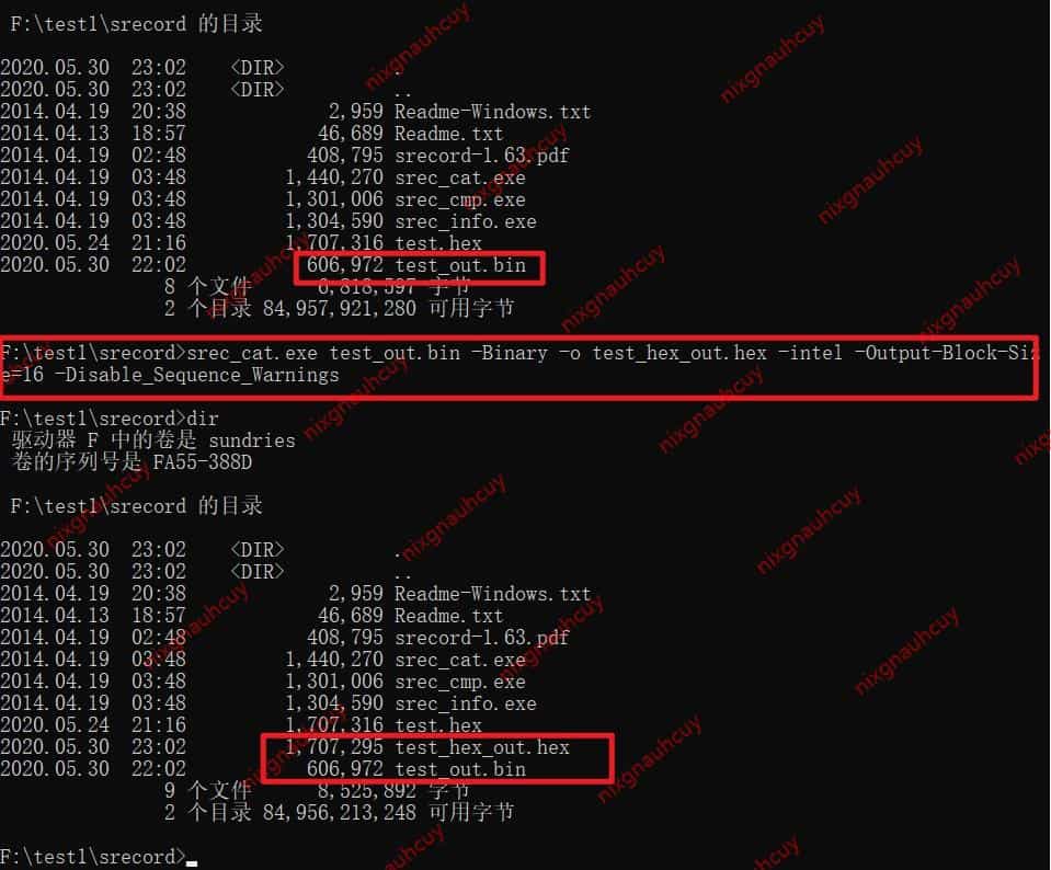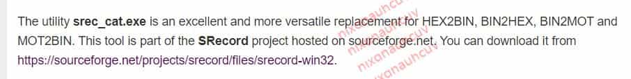 翻译一下: srec_cat.exe 应用程序是 HEX2BIN,BIN2HEX,BIN2MOT 和 MOT2BIN 的绝佳替代品,用途更广泛。该工具是在 sourceforge.net 上托管的 SRecord 项目的一部分。您可以从 https://sourceforge.net/projects/srecord/files/srecord-win32 下载。