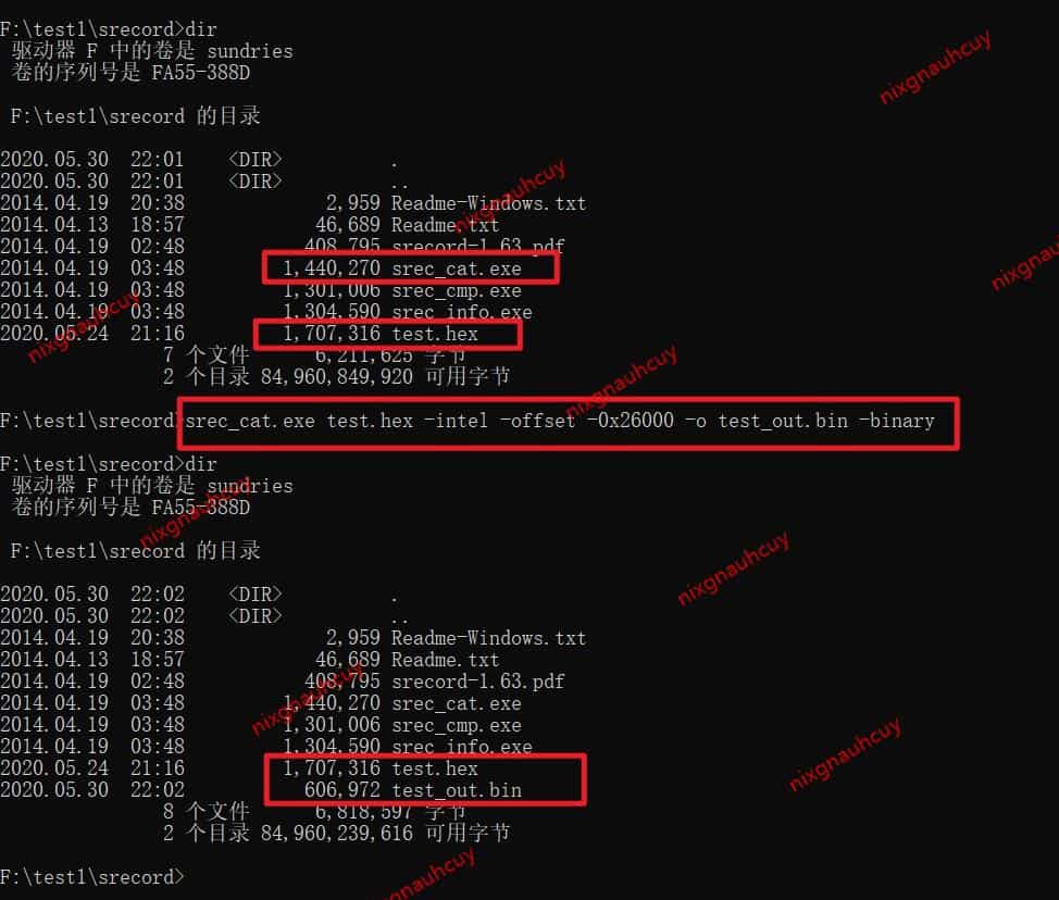 上面转 axf 时,已经有了 test 文件,这里我把 srec_cat.exe 放在了 F:/test1/srecord 中,并且把要转换的 test.hex 文件放在了 srecord 文件夹中