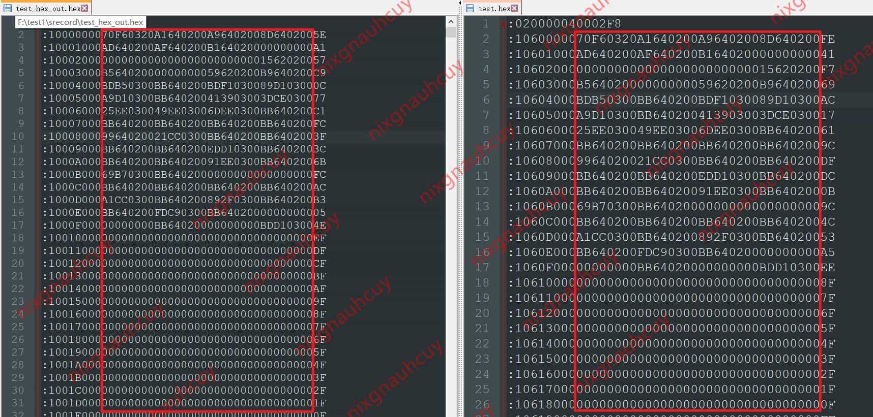图左边是生成的hex文件,图右边是原先的hex文件