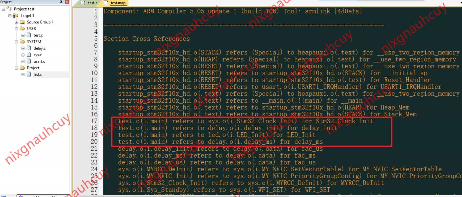 因为我的 main 写在 test.c 中,所以 test.c 中因为 main 函数调用了 sys.c 中的 Stm32_Clock_Init 函数、调用了 delay.c 中的 delay_init 函数和 delay_ms 函数、调用了 led.c 的 LED_Init 函数,所以, 生成的 map 中 Section Cross References 指出了之前的相互引用关系。