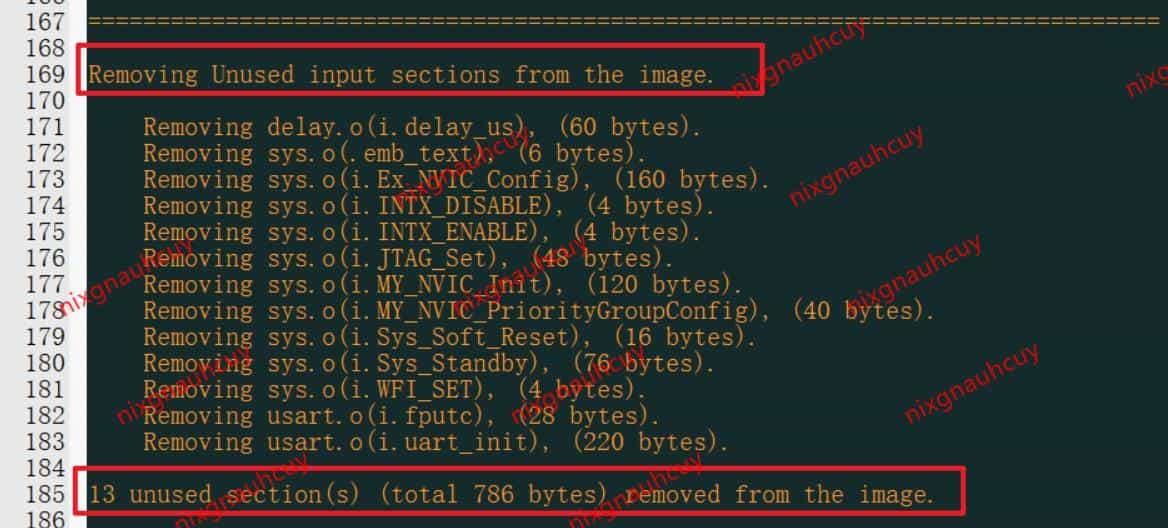 从上面 main 函数的执行中,可以看出我没有调用 delay_us 和 uart_init 串口的初始化函数,所以编译器把他们找出来并移除,共 13 个段没有被调用,大小为 786 字节。