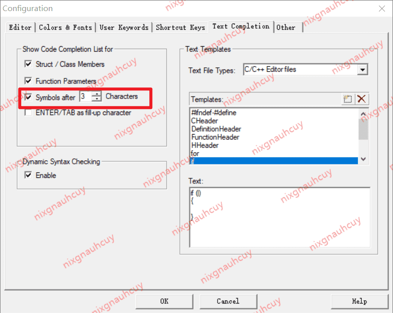在工具栏中找到小扳手图标或者在菜单栏中打开 Edit-Configuration ,打开后点击 Text Completion 找到 Symbols after x Characters ,勾选并填入你需要在输入第几个字符后开启补全提示。