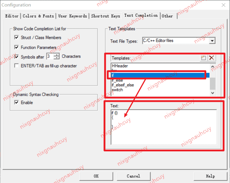 同样在工具栏中找到小扳手图标或者在菜单栏中打开Edit-Configuration ,同样的打开后点击 Text Completion 找到 Templates ,这里拿 if 来举例,在 Templates 窗口中,新增一个 if ,名字可以根据需要来取,怎么方便怎么来,这里为了方便演示,给它设定为 if ,然后我们在下方 Text 框中对应的给 if 增加对应文本。