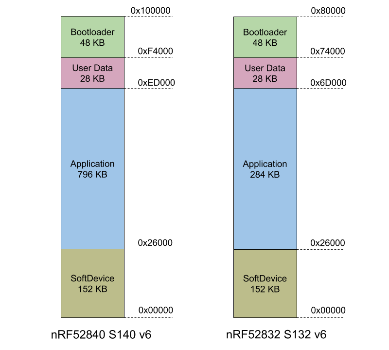 图片以 nRF52840 S140 v6 为例,52840 有 1MB 的 flash 和 256Kb RAM, 从上图可以看出 flash 最下边是 SoftDevice(蓝牙协议栈),中间是 Application(应用层), 再往上是 UserData 和 Bootloader。SoftDevice 下边还有 MBR(Master Boot Record,主引导记录)下边我们在详细分析它们。