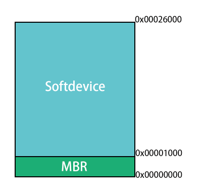 上边图中可以知道 SoftDevice 在 Flash 中的映射地址是 0x00000000-0x00026000,总共是 152Kb,但是其中要拆分成 4Kb 的 MBR 和 148Kb 的 Softdevice。